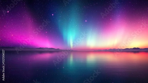 Dramatic nighttime abstract background idea. Stunning aurora borealis reflecting on tranquil water, vibrant colors illuminating the night.