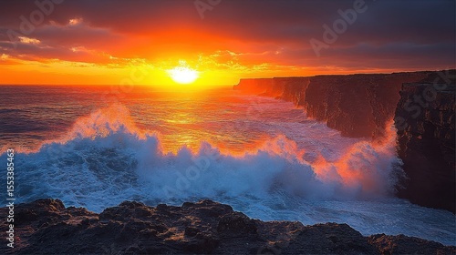 Dramatic Ocean Wave Crashing Against Dark Rock Coastline at Fiery Sunset