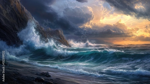 sea, wave, ocean, water, shore, beach, cliff, coast, storm, sky, cloud, sunlight, light, dark, dramatic, rough, spray, crashing, movement, turbulent, powerful, serene, nature, landscape, horizon, distant, perspective, texture, teal, blue, grey, rocky, stone, wild, wet, wind, energy, outdoors, seascape, weather, white, surface, laundered, foamy, dawn, evening