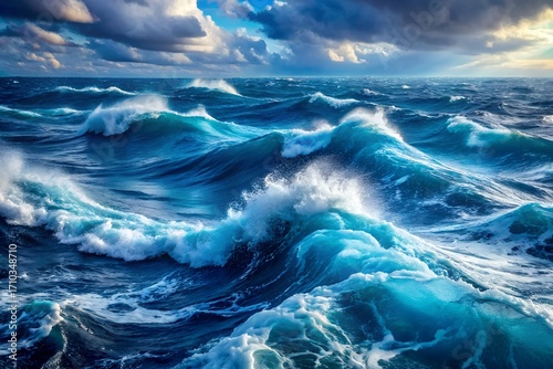 ocean, sea, wave, water, blue, turquoise, stormy, cloudy, sky, sunlight, nature, landscape, seascape, powerful, dynamic, crashing, foaming, spray, white horse, horizon, maritime, aquatic, environment, weather, rough sea, storm, coast, coastal, marin, deep blue, surface, energy, movement, travel, adventure, background, texture, abstract, artistic, calming