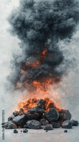 Dramatic pile of burning coal with intense flames and billowing smoke against a light background industrial energy