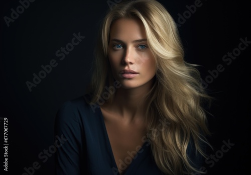 Dramatic portrait of a young beautiful blonde woman in dark colors. Women's beauty and fashion.