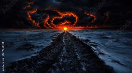 road, sunset, storm, cloud, dramatic, fiery, apocalypse, surreal, dark, sky, moody, landscape, eerie, horizon, ominous, glowing, mysterious, path, twilight, atmospheric, fantasy, stormy, wilderness, night, epic, adventure, thunderstorm, contrast, shadow, scenic, powerful, black, orange, intense, heaven, destruction, nature, dreamlike, artistic, visionary, chaos