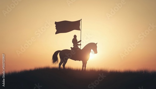 Dramatic Scene Featuring A Medieval Knight On Horseback Holding A Flag In Silhouette Against The Sky, Evoking A Sense Of History.