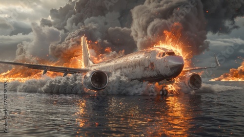 Dramatic scene of a commercial airplane crash landing into the ocean with flames and smoke.
