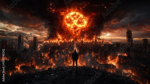 Dramatic Scene of Apocalypse with Fire and Cityscape at Dusk