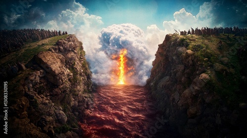 exodus, red sea, parting, miracle, divine, fire, pillar, cloud, people, crowd, cliff, rock, mountain, landscape, dramatic, epic, biblical, faith, journey, freedom, water, sea, ocean, sky, cloudscape, scene, story, history, religion