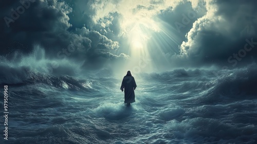 dramatic seascape silhouette of jesus walking on turbulent waves storm clouds swirling overhead shafts of divine light breaking through darkness