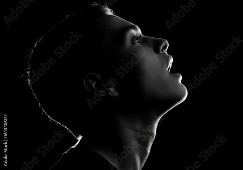 silhouette, portrait, profile, face, shadow, dark, light, contrast, dramatic, moody, sideview, human, person, expression, lip, nose, cheek, neck, contour, minimal, black, white, artistic, emotion, mysterious, elegant, outline, beauty, studio, photo, highlight, monochrome, shape, texture, detail, shadow, minimalism, lighting
