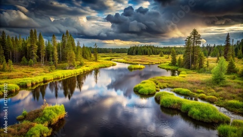 kola peninsula, swamp, forest, dramatic sky, russia, wilderness, nature, landscape, river, water, tree, cloud, moody, atmospheric, scenery, photo, travel, adventure, exploration, arctic, birch, pine, bog, wetland, wildlife, remote, untamed, peaceful, serene, tranquil, solitude, green, blue, grey, rustic, wild