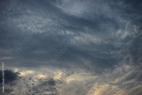 dramatic sky with a curtain of gray clouds covering the bright sun.