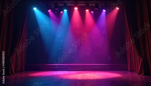 Dramatic stage lighting illuminating an empty theater, showcasing vibrant colors and shadows , atmosphere, color