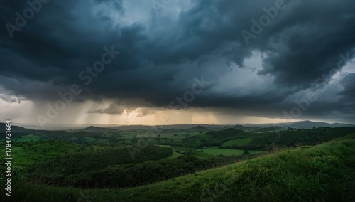 Dramatic storm clouds gather over lush green rolling hills as rain streaks down onto a distant valley, creating a powerful natural scene.