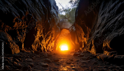 Dramatic sunlit cave entrance. A rocky path leads to a bright exit, perfect for adventure, exploration, or spiritual themes. Use in travel, fantasy, or game design.