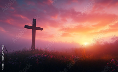 DRAMATIC SUNSET AT HILL WITH CROSS