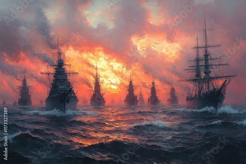 sunset, fleet, ocean, sea, sky, cloud, colours, sailing, drama, naval, maritime, horizon, nautical, adventure, wave, light, dusk, coastline, sailing vessel, journey, exploration, seascape, nature, beauty, silhouette, warmth, history, romance, voyage, wind, storm, atmosphere, travel, art, majestic, scenic
