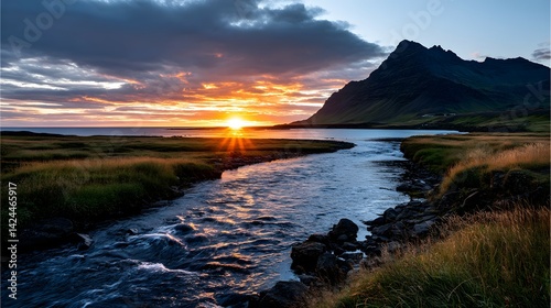 sunset, river, iceland, mountain, peak, landscape, nature, scenery, cloud, dramatic, sky, twilight, horizon, ocean, water, stream, vibrant, colours, light, rock, stone, grass, meadow, gold, sunlight, ray, dark, vista, travel, eruption, adventure, beauty, scenic, photo, photo, idylli, moment, stunning, amazing, beautiful, view