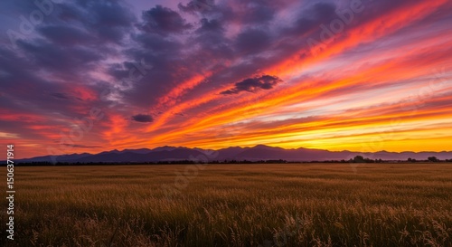 Dramatic Sunset Over Field and Mountains with Vibrant Sky