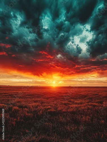 sky, cloud, sunset, field, horizon, landscape, red, teal, dark, light, sun, glow, orange, yellow, dramatic, nature, rural, evening, colours, vibrant, dusk, scene, wide, open, space, grass, plant, weather, storm, moody, scenic, view, bright, peaceful, calm, tranquil, beauty, natural, environment, summer, season, land, agriculture, farm, countryside, gold, huge, atmosphere