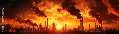 Dramatic sunset over industrial skyline, with dark smoke billowing from chimneys against vibrant orange sky.