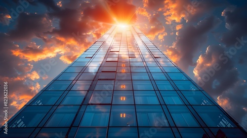 Dramatic Sunset Silhouette of a Towering Modern Skyscraper with Reflecting Glass Facade