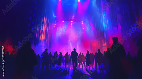dramatic, theatrical, lighting, effect, vibrant, saturated, colours, dynamic, shadow, creating, captivating, mesmerizing, atmosphere, stage, during, live, performance, concert, aglow, illustration