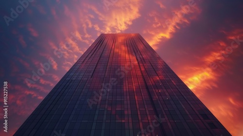 Dramatic view of a tall glass skyscraper reflecting the fiery sunset, ideal for architectural design, real estate promotion, and corporate branding.