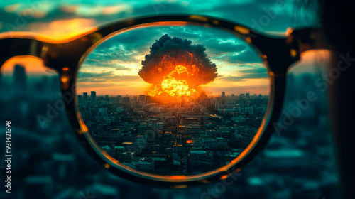Dramatic view of an explosion in the sky, seen through sunglasses, highlighting the urban skyline.