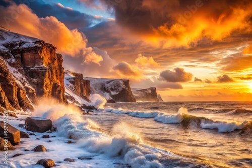 Dramatic waves crashing against the rocky shoreline, with snow-dusted cliffs towering above, set against a warm orange and pink sunset sky