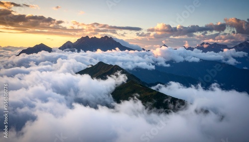 Dramatische Felsberge im Sonnenlicht, Wolkenmeer unten, lebendiger Himmel mit warmen Lichtakzenten.