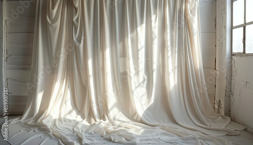 curtain, white, room, window, light, draped, fabric, soft, minimalist, sunlight, photo, interior, design, home, decor, simple, elegant, clean, modern, bright, airy, empty, sparse, background, texture, smooth, crease, drape, fold, shadow, pattern, contrast, tone, natural, studio, wall, floor, space, art