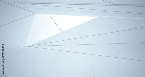 Drawing abstract architectural white interior of a minimalist house with large windows. 3D illustration and rendering.