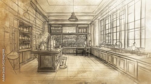 Drawings of an old chemistry room, done in a sketch style. It looks like an old engraving.