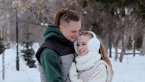 couple, love, winter, snow, park, embracing, happy, smiling, romance, human relationships, togetherness, joy, affection, tenderness, intimacy, warmth, cold, winter clothes, earmuffs, dreadlocks, man, woman, boyfriend, girlfriend, dating, happiness, lifestyle, seasonal, outdoors, nature, tree, landscape, scenery, white, cold weather, freezing, winterly, christmas, holiday, vacation, travel, fun, enjoyment, leisure, recreation, activity, weekend, get-away, serene