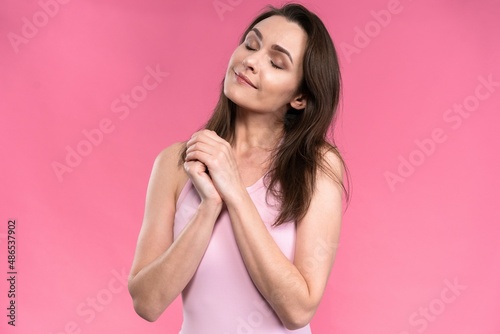 Dreaming or making wish young woman in sleeveless t-shirt making a wish with hands put together pose isolated on pink background