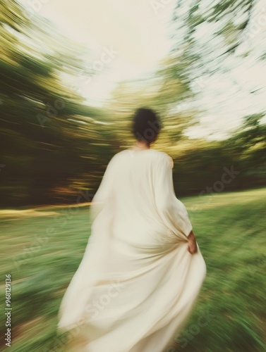 blurred, woman, walking, park, dress, dreamlike, serene, peaceful, gentle, aethereal, motion, texture, fabric, contemplative, soft, subtile, middle, eastern, quiet, daytime, nature, greenery, flowing, movement, demure, slim, tranquil, artistic, modest, elegant, feminine, flow, softness, peacefulness, solitude