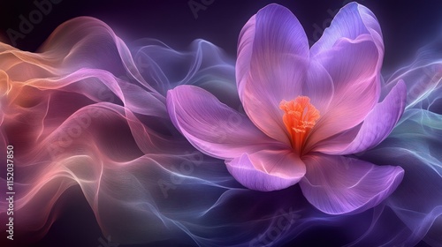 Dreamlike purple crocus flower with flowing, colorful smoke.