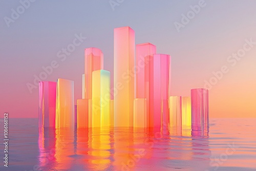 abstract, city landscape, colours, water, gradient, geometric, minimalist, digital artwork, sunset, horizon, neon, ambient, modern, artistic, semitransparent, night, fantasy, surreal, aesthetic, polygon, vibrant, soft, architecture, musical, dreamlike, light, serene, peaceful, shape, sky, visual, color palette, contemporary, creative, metropolis, design, imaginary, futuristic, elegant, peace, illusion, artwork, scenery, inspiration, bright, mood, visualisation