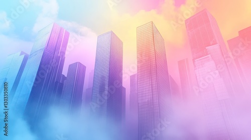 Dreamy Cityscape: Pastel Skyscrapers Emerging from Clouds