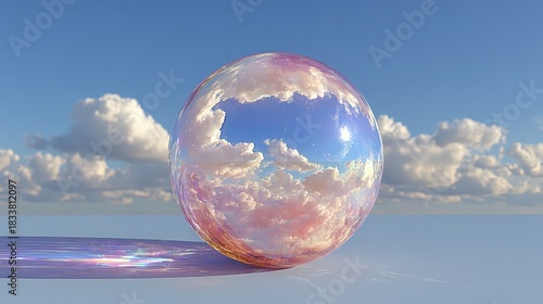 Dreamy Cloudscape Reflection in Glass Sphere on White Surface