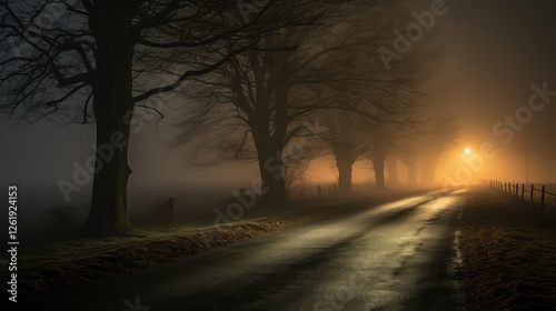 dreamy, country, road, night, illustration, fog, aethereal, mist, tree, bush, glow, street light, warmth, comfort, eerie, scene, wrap, outline, distance, soft, faint, visible, mysterious, tranquil, serene, quiet, peaceful, solitude, landscape, journey