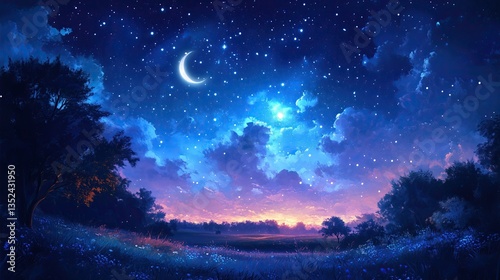 Dreamy Night Sky Landscape with Crescent Moon and Stars, Twilight Meadow Fantasy Art Scene, starry night landscape