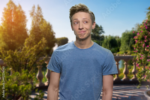 Dreamy pensive teen boy. Teen american boy in gray t-shirt. Green summer's terrace on the background.