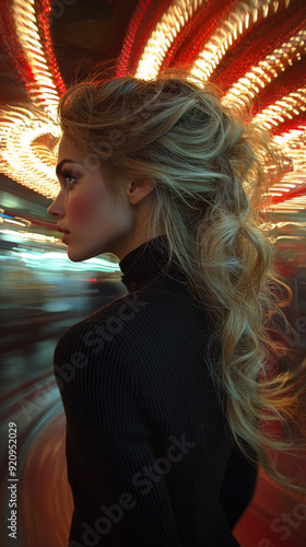Dreamy Portrait of a Blonde Girl in Front of Sparkling Carousel Lights