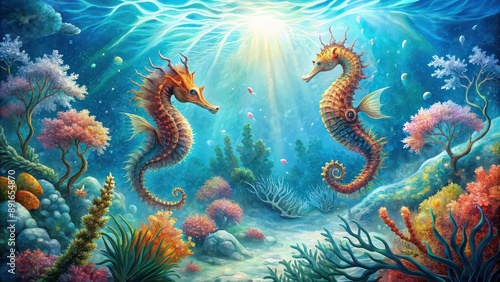 Dreamy underwater landscape with dancing seahorses, swirling currents