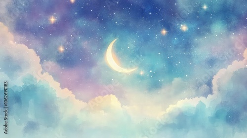 Dreamy watercolor sky painted in soft blues and purples with glowing stars and a crescent moon shining through layers of semi-transparent clouds.