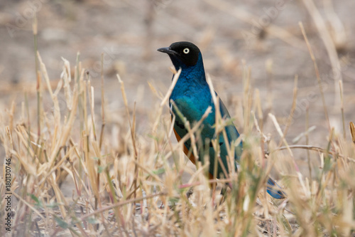 songbird, plumage, vogel, shiny, black, blue, brown, white, glaucous, gleaming, iridescent, savanna, bush, farmland, tanzania, kenya