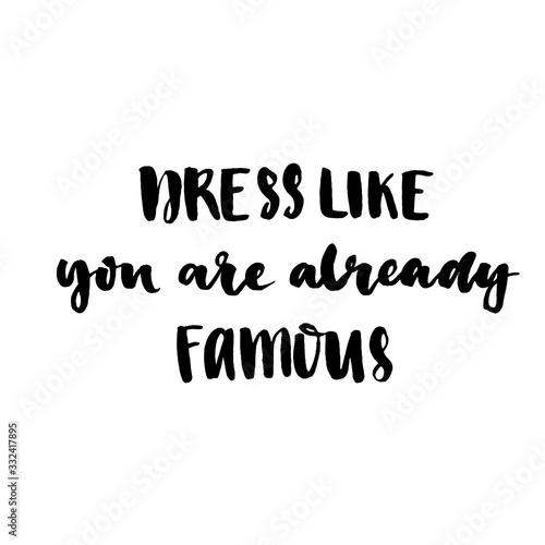 Dress like you are already famous. Motivation slogan about clothes, fashion, self-esteem. Brush lettering with black ink isolated on white background