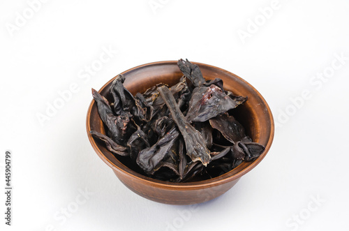 Dried dog treats in a brown clay bowl on a white background. Thi