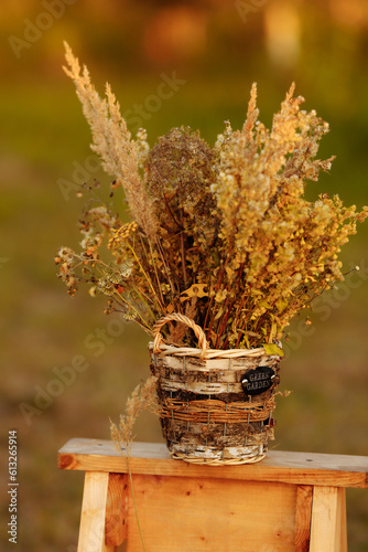 Dried flowers in a vase from a basket on a wooden stand against a blurred background of a field flooded with sunset light.